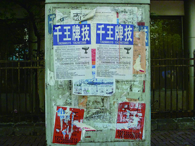东城朱砂街一临时房外墙上满是“牛皮癣”。