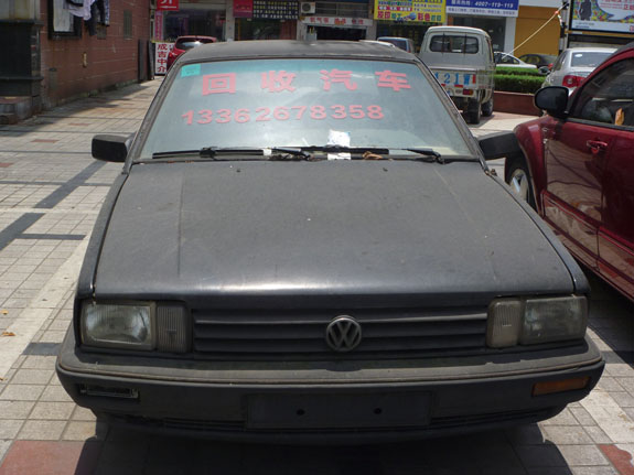 这是记者在县前街人行道上拍摄到的情景。在黄城街头,经常可以看到这种几近报废的“老爷车”长期占据停车位,有的甚至被改装成了广告摊位,不仅浪费城区的停车资源,更影响了市容市貌。