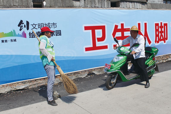 今年以来,东城街道努力创新环卫管理模式,将街道各社区划分为若干个网格,实施“网格化管理”,在每个网格配备管理员,对区域内卫生保洁情况进行巡查。图为方山社区管理员黄鲁军正向保洁员了解情况。
