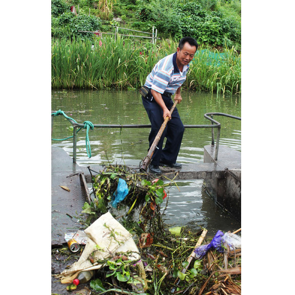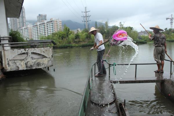 3. 他们的船一直开至二环南路,三位保洁师傅早已汗流浃背,一次来回大概两个半小时,每天至少2次,垃圾多的时候达5次。