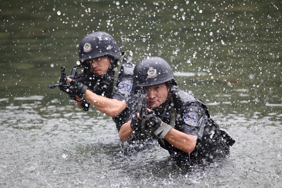 9月9日,浙江省台州市公安局黄岩分局巡特警大队特警队员在黄岩区屿头乡的溪流中开展野外搜捕训练。为了提高特警们的实战能力,该队官兵赴西部山区开展了各种模拟实战环境的训练活动。