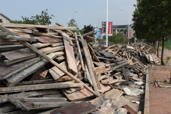 东城街道王西路边垃圾遍地;嘉木路一侧几十米的道路上堆满废旧木料。
