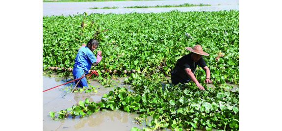 台风过后,永宁江永宁公园段聚集了大量水葫芦。公园连续几天出动30多名保洁员,对江上的水葫芦进行清理。