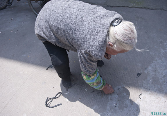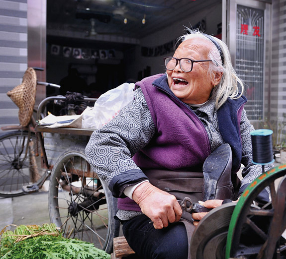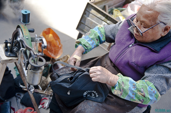 王玲娥阿婆,北洋镇官岙村人,今年91岁,有52年补鞋经历。年轻时,她背着补鞋机,闯过大上海,到过山东城乡,几十年来,从没停止过补鞋生涯。如今,年龄大了的王阿婆,以一部三轮车代步,还在赶附近的潮济、山下与北洋三个集市,每市必赶。算起来,10天内她就得赶6天的场子。