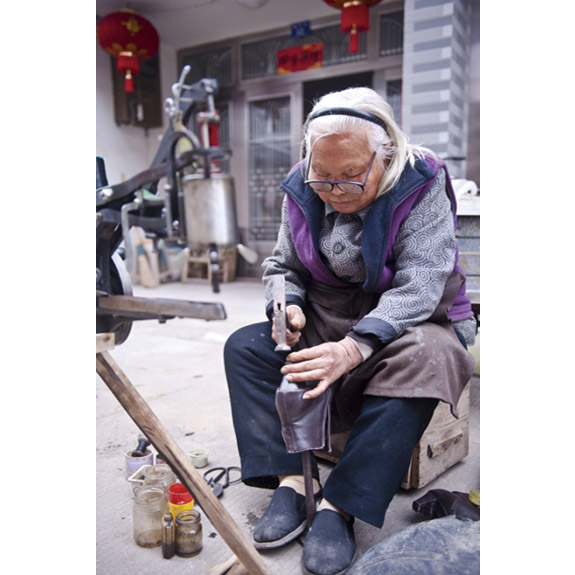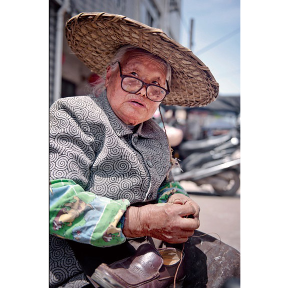 王阿婆今年91岁,黄岩区北洋镇官岙人。她有52年的补鞋经历,每逢潮济集市,都来潮济街摆上补鞋摊,忙个不停。她走南闯北几十年,她的补鞋摊曾摆过上海街头,也曾走遍山东城乡。如今,仍然身体硬朗,思维清晰,虽有好几个儿女,仍然坚持凭手艺自食其力。