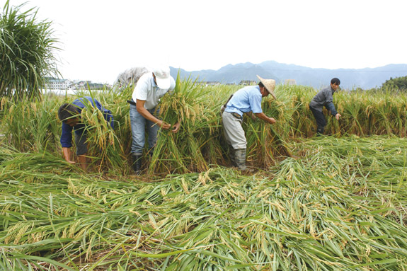 连日来,头陀镇洪屿、中岙、广兴岙等30多个村的粮农纷纷下到田间,扶起受前阶段强降雨影响而倒伏的晚稻,并用稻草扎成捆。