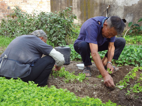 台风“菲特”过后,10月13日,头陀镇溪头村的解大伯不误时机,跟老伴一起在自家菜园里补种各种菜苗。