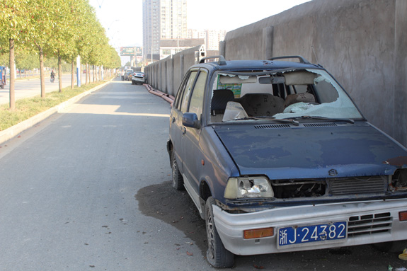 继本报曝光西城松岩路一带出现破损轿车无人管的情况后,隔了几日,记者再次前往该处,发现破损的轿车还是停在这里。不仅如此,在此车不远处,记者又发现了另外一辆破损的轿车。这辆车4个轮胎都已没气了,据附近居民说,此车停着也已有很长时间了。