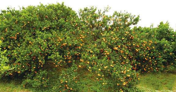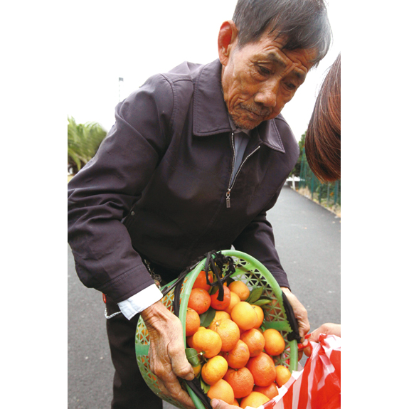 黄岩蜜橘甲天下,如今正是橘黄时。澄江岸边的中国柑橘观光园里满园橘香,一个个橘子小灯笼似地压弯了树枝。橘农们拿着篮子和剪刀三五成群地采摘,忙得不亦乐乎,没一会,一个个竹篮里就装满了黄澄澄的橘子。好一派橘子丰收的景象!