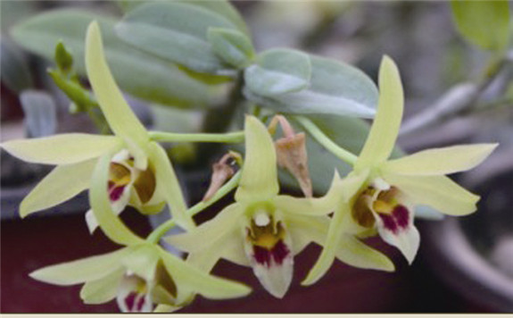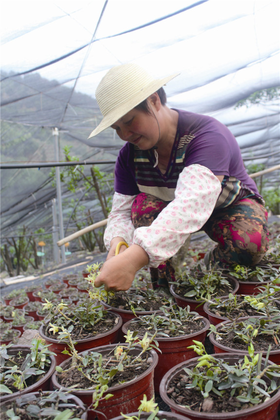 花瓣外形跟兰花相似,呈黄绿色。花蕊柱带紫红色条纹,唇瓣白色,长卵状三角形布局,铁皮石斛花娇嫩可爱。近日,在北洋渔岙村的铁皮石斛基地,记者看见工人们动作熟练地采剪着石斛花。基地工作人员说,石斛花经过专门烘干,制成花茶,具有生津养胃、滋阴清热等药用功效。由于产量少,石斛花茶很有“市场”,而且身价不菲。