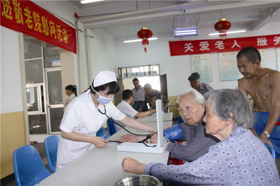 7月9日下午,在第25个世界人口日前夕,区人口计生局联合院桥计生办走进院桥敬老院,为老人们送去牛奶、西瓜、毛巾等物品。图为院桥中心卫生院的两位医护人员帮老人们测量血压,讲述一些老年人常见疾病和预防措施,并给老人们提供合理的建议。