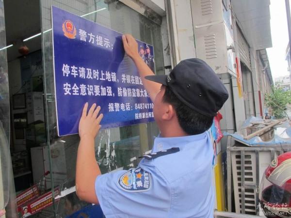 针对超市、网吧、菜场等处所电动车、摩托车、自行车(简称“三车”)被盗案件时有发生的情况。连日来,院桥派出所通过加强巡逻、温馨提示,要求业主落实做好人防、防物、技防措施,全力做好防范,减少“三车”被盗案件的发生。