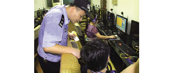 暑假以来,黄岩公安分局多次组织各派出所民警对辖区网吧的实名登记、消防安全、禁止未成年人进入网吧等执行情况进行了检查,从源头上防止各类侵害学生安全行为的发生。图为城西派出所民警正在一网吧对上网人员的身份进行核实。