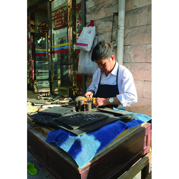在东禅巷路口的角落里,你会发现这里有一处常年摆出来的修鞋摊,记者也是在一次修拉链时碰巧打听到这里的。修鞋匠谢师傅是位聋哑人,他和顾客交流的方式也很独特,通常他会给顾客一支粉笔,让他们在板上写字传达。平时他就坐在长凳上,围着一条皮围裙,默默地为周边的老街坊修鞋换拉链。他在这一带修了40年的鞋,熟练的手艺和公道的价格令他小有名气。