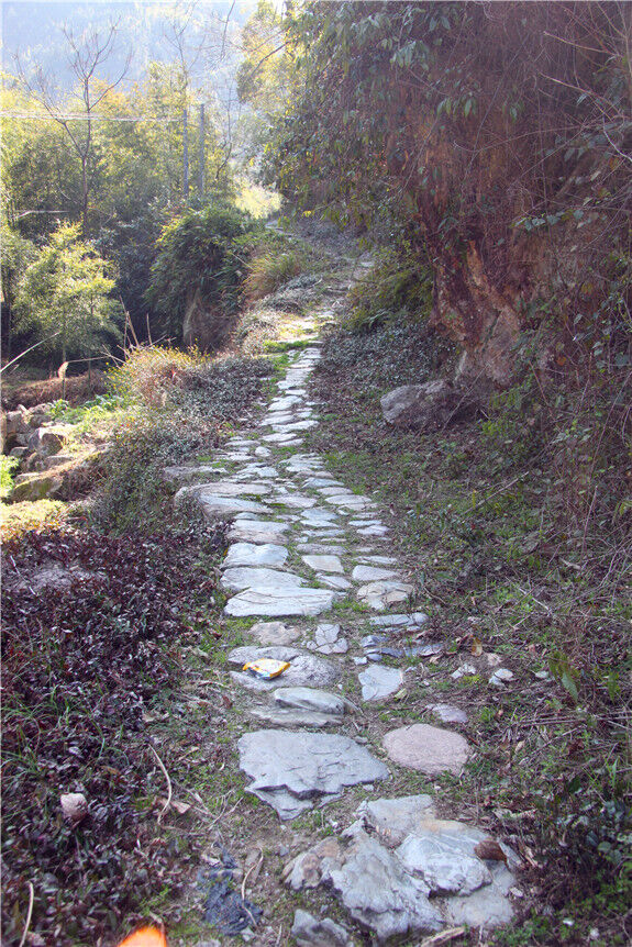 宁溪岭根村,一条古道隐于田间,向远方不断地延伸,块石状的路面经过岁月的打磨,在阳光下闪闪发光。一些微细的长痕清晰可见,当地人说这是当年拖拉毛竹留下的痕迹。这就是黄永古道的起点。黄永古道途经富山乡半岭堂、半山等村,是古代黄岩西部通往永嘉的主要交通枢纽。这条古道大致始于明清之际,现存全长15公里,宽约二米,是赏景怀旧的好地方。
