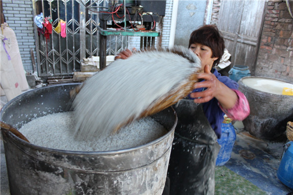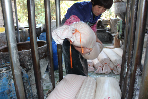 2.将湿润的大米倒入磨粉机磨细,米浆顺着机器的槽口灌到米浆袋里,工人们用绳子绑住袋口。