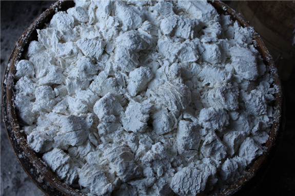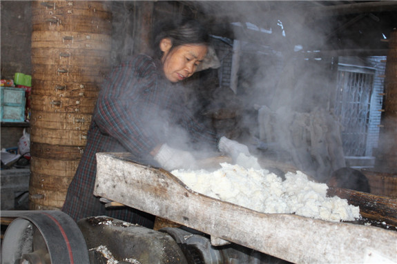 4.将渗出水分的米糊块,敲打成米粉,将米粉抖散,均匀地铺在蒸笼里,蒸上二十多分钟。