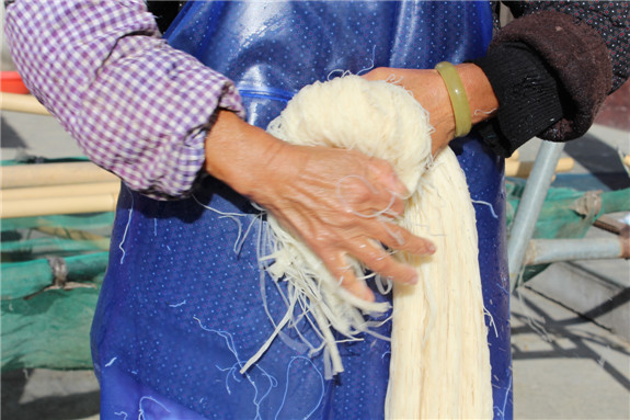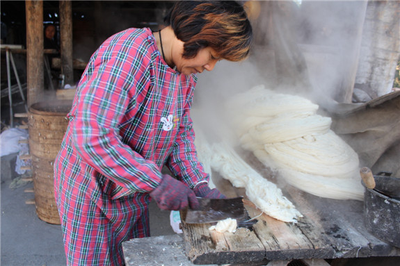 8.从蒸笼里出来的米面很容易粘在一起,这时,放在水中容易把粘在一起的面分散开且不易断,如碰到粘在一起的米面需用手搓散,使它不粘在一起,之后挂在竹竿上。