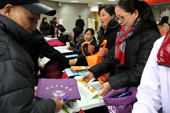 志愿者们向市民发放平安家庭宣传画报。