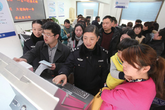 3月11日上午,黄岩公安分局出入境办证大厅内,工作人员热心地指导办证群众使用自助设备办理相关业务。据悉,近来黄岩公安出入境管理大队积极开展“优服务、创满意”活动,切实提高服务质量,受到办证群众的好评。