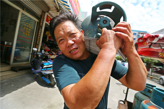5.师傅骑着三轮车穿梭在大街小巷送煤气。