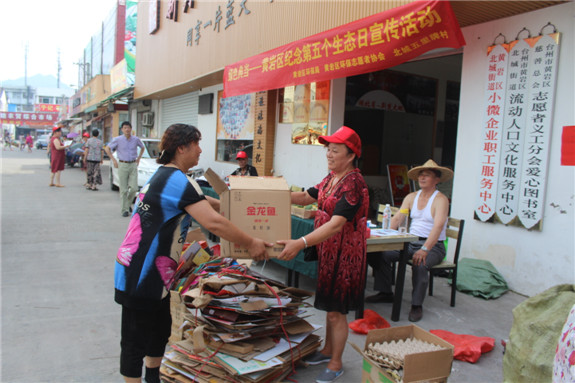 6月30日是浙江省第五个生态日。区环保局联合区环保志愿者协会及社区开展了“绿色典当”活动。一大早,市民已将废纸张和饮料瓶准备就绪,等着“当铺”开张。收集3公斤以上废纸或者10个以上饮料瓶,就可以换一盆盆栽。虽然天气比较炎热,市民乐在其中,享受着变废为宝的乐趣。截至活动结束,双江社区、海棠新村、砚池社区、嘉丽阳光苑、北城五里牌村等活动点共收集了236只饮料瓶,562斤废纸。此次活动,300盆小盆栽被市民领回了家。