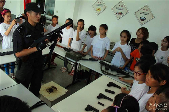 7月9日上午,黄岩三友学校的25名外来民工子女走进黄岩巡特警大队,参观警营训练生活环境,观摩战术表演,接触武器装备,在近距离体验警营生活中欢度暑假。图为学生们在体验武器装备。