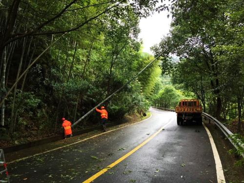 黄岩“公路人”一早奋战在路上,清除台风刮倒的树木,确保公路畅通。