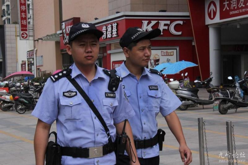 图为7月16日,民警和协警头顶烈日,在大润发超市前面路段徒步巡逻,汗水湿透警服。
