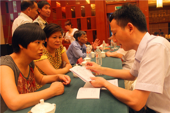 日前,在罗曼国际大酒店里,来自省人民医院肾脏科的李一文、陈茂盛(右一)两位教授正为前来询问的市民解答相关疑问。据悉,这是区中医院举办的第二届肾友联谊会。
