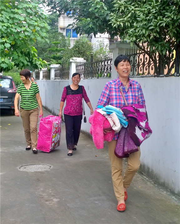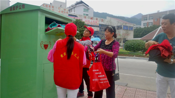 9月23日上午,东城街道桔洲新村的居民纷纷从家里搬出闲置衣物,将其投放到“绿房子”里。原来,这所“绿房子”是黄岩慈善义工协会安置在该社区的衣物捐献点。