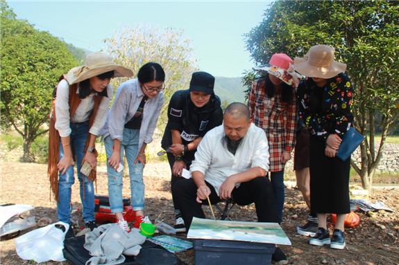 10月11日,我区中小学美术教师采风团走进新前街道剑山村,他们泼墨挥毫,现场写生。田间小路、水库岸边,采风团铺开行当,专心作画,互相交流创造思路,畅谈美丽乡村之旅的感受。采风结束后,他们还把作品赠送给当地,挂在文化礼堂供村民观赏。