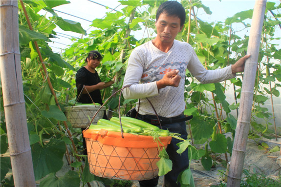 近日,记者在新前街道前洋村的一处瓜果种植基地看到,鲜嫩的蒲瓜带着花蒂挂满藤蔓枝头。连日来,基地负责人姜汝华夫妇每天都得到棚内采摘,以供市场需求。清脆爽口,带着清香的本地蒲瓜,物美价廉,在市场上很畅销。