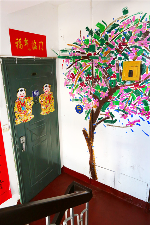 近日,记者看到双江社区玉兰新村21幢1单元的整个楼道被画满了一幅幅墙绘,有太阳花、葡萄架、和谐号动车……楼道里充满了温情。据了解,这是该幢楼的住户吴庆扬、谢群英等居民携手共绘的。“我们因地制宜,根据楼道特色,从一楼到六楼,共画了8幅墙绘,花了两个晚上的时间。”吴庆扬告诉记者。除此之外,楼道上还挂着10幅水彩作品,都是吴庆扬的作品。