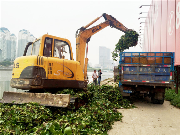 傍晚时分,看着岸上一排排谁得小山般高的水葫芦,陈师傅开始活动双臂,缓解一天的疲劳,而岸边的水葫芦也次第运往垃圾填埋场。