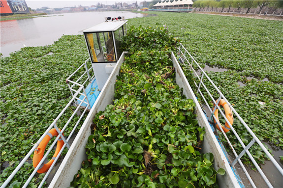 这些水葫芦顺着江水,悠然停驻在江面,有的顺着流水打转被堵塞在桥墩周边,有的在成为白鹭的临时栖息地,有的则伴着江水的律动,荡起一层涟漪。江面上一艘机械作业船如同水上“吸尘器”,张开“长臂吸嘴”伸入水里,围捕密密麻麻的水葫芦,船在水中慢慢调头,江面的“凤眼莲”就在传送带的作业中被吸了上来,一骨碌滚到了船里,船的吸附能力很强,速度极快,出航没几分钟,一船便被塞得满满的。