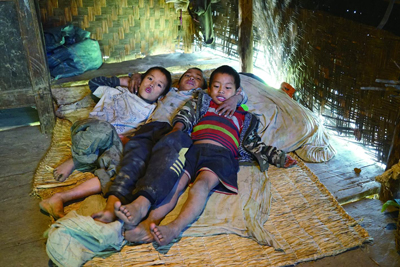 衣衫褴褛的三个小孩住在四处漏风的房子里,生活艰苦。