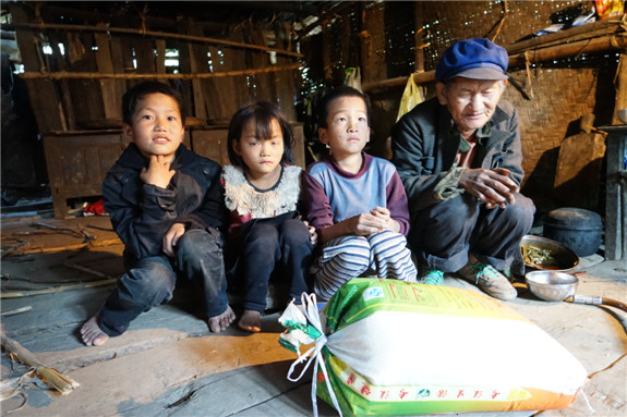 三个孩子和盲爷爷一起生活,区慈善义工们把大米和衣服送给他们。