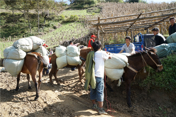 在当地爱心人士的陪同下,几匹马驮着衣物进了大山。图为到达目的地后,区慈善义工和当地村民一起正在卸载、搬运衣物。