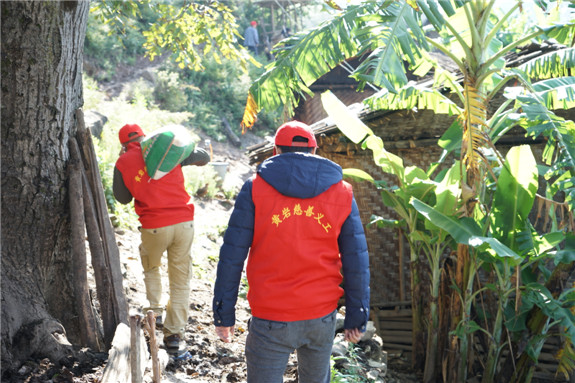 在一些狭窄泥泞的山路小道,区慈善义工背着大米、衣服去慰问当地贫苦村民。