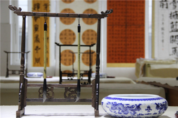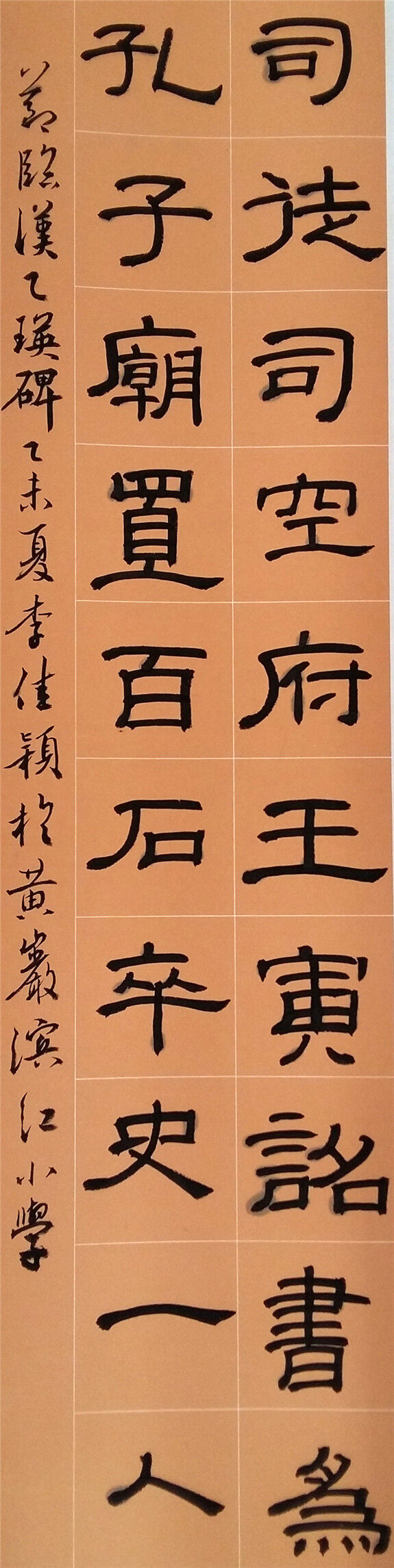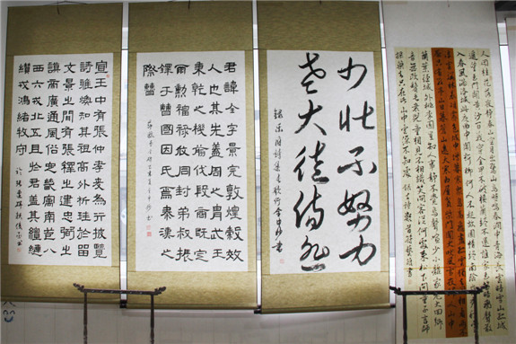 滨江小学的书法教室,四周挂满了学生创作的书法作品,有对联、条屏、扇面等,形式多样,异彩纷呈。这是一所以书法为特色教学的学校,曾被省教育厅认定为第三批“浙江省艺术特色学校”。学校的橱窗里、教室的外墙上也都展示了学生的书法作品,整个校园飘溢着浓郁的笔墨书香。