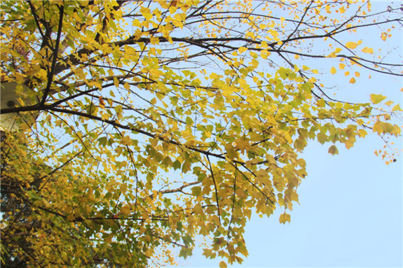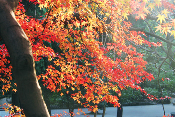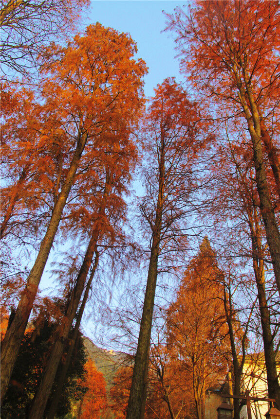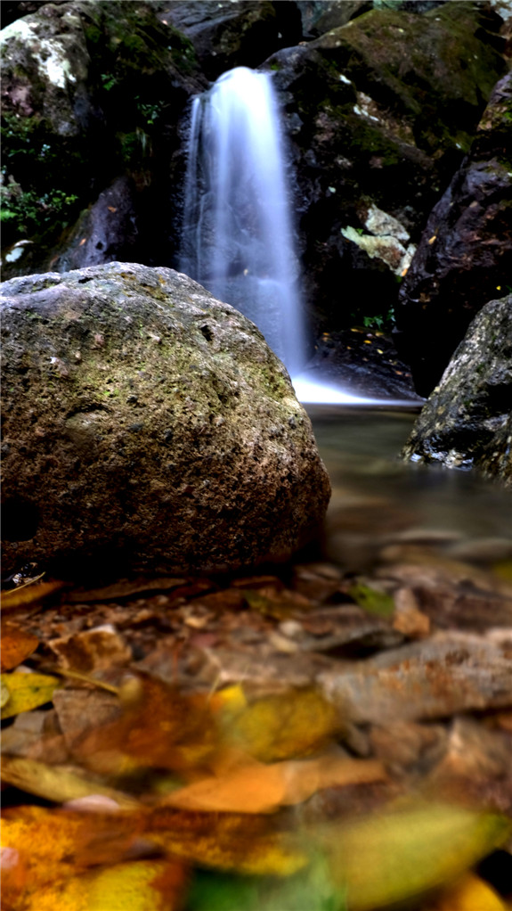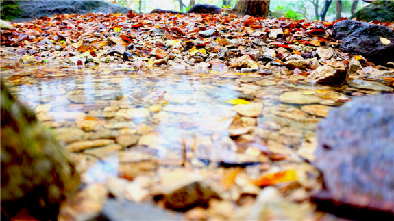 连续几天的阴雨天气,最近终于放晴。山涧飞瀑似霰漫天飞,流水唱着欢快的歌谣。经过雨水洗礼的红枫娇滴滴地相拥在绚丽的冬日,红得似火,充满热情。红杉层层斑驳的树影映衬着地上的落叶,美得像一幅油画。缤纷飘舞的落叶拍打着翅膀,追随着流淌的溪水,拥吻着涧底一泓清泉,那是一场水之恋,一曲冬之赞歌。