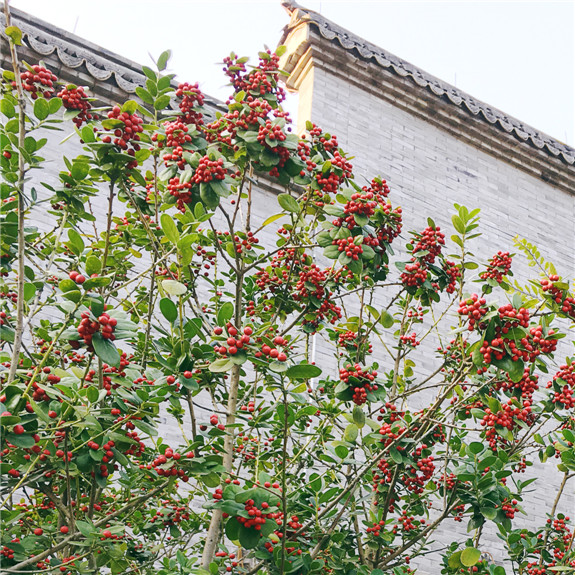 九峰公园古民居附近,墙头的树木结着火红的果实,这时如果下点雪,红果子沾着点雪花,想必更有一番情趣。游客们在公园里倾听风吹红枫的昵喃,看看灵动的落叶溪流,冬日,漫步九峰公园,移步即景的即视感,好生惬意!