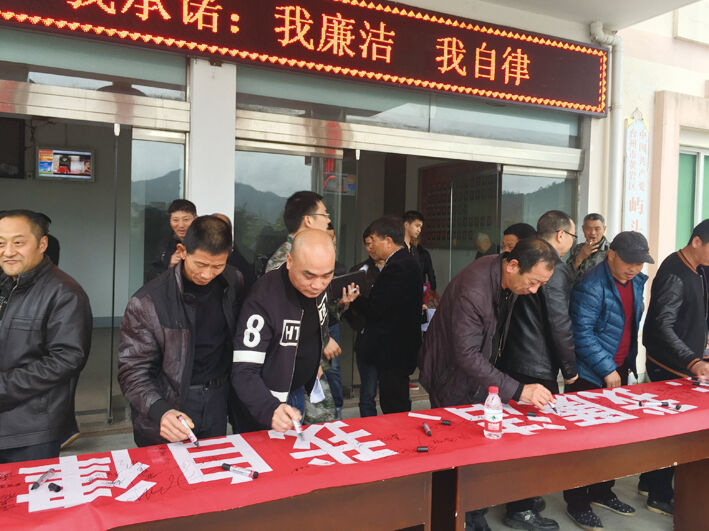 为进一步增强党员干部廉洁自律意识,近日,屿头乡开展党风廉政暨作风建设倡议活动,28个村的村委会主任、书记、村监会主任和全体机关干部在“我承诺:我廉洁,我自律”的横幅上签名,当天,乡党委书记、各村主职干部还签订了党风廉政建设承诺书。