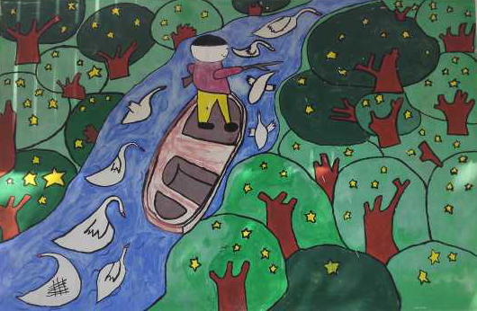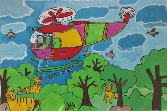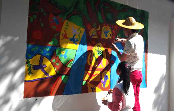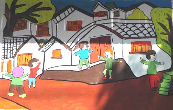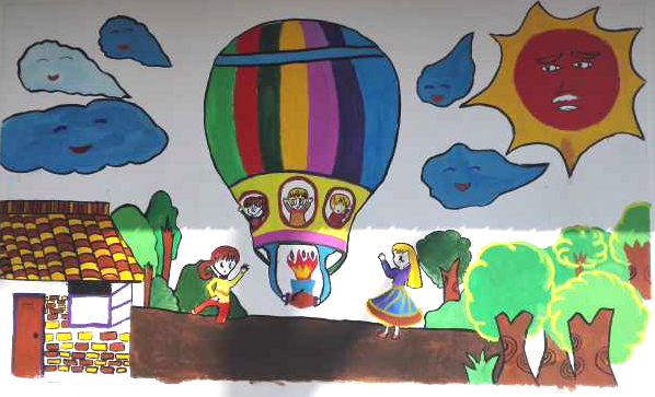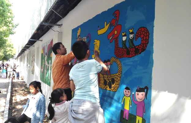 小志愿者们头顶着烈日,正热火朝天的作画,打底、上色、提着各色刷子、小桶和墙面漆,开始井然有序地为墙壁填上五彩斑斓的色彩。“我来画树干,你来画枝条。”“你拿颜料我来涂。”大家分工明确,团结协作,有条不絮的投入到墙画的制作中。