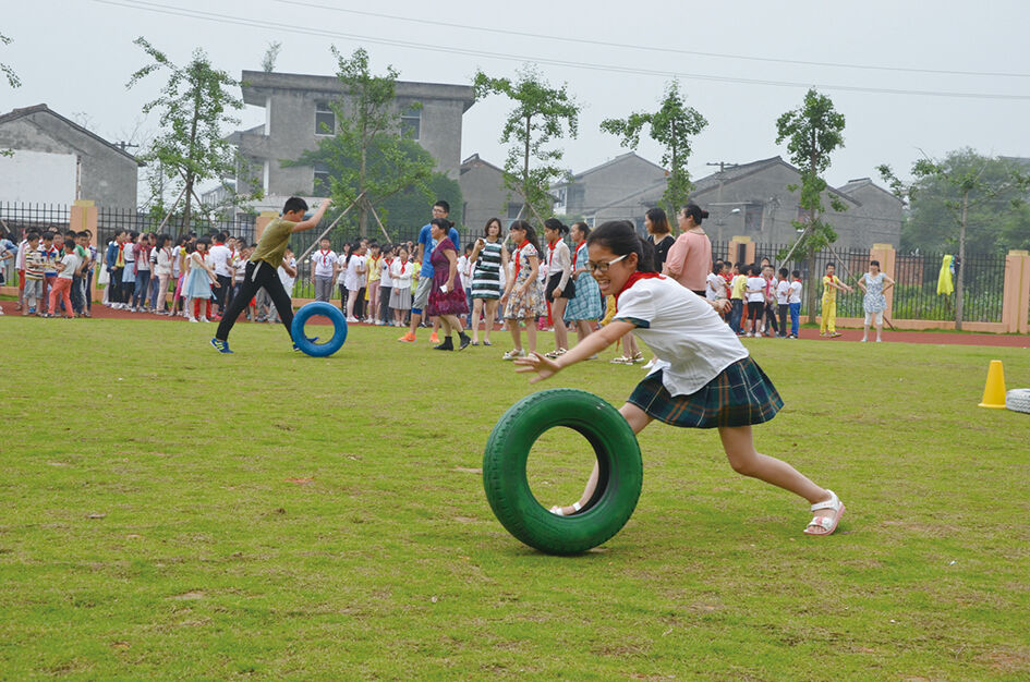 6月1日,江口街道第二小学开展以“奔跑吧”为主题的趣味体育活动,以庆祝“六一”儿童节,全校700多名学生参与这次活动。图为学生正在进行传球(滚球)接力赛。