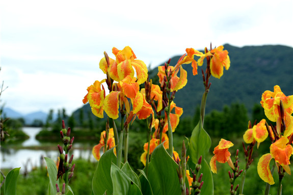 赏美人蕉慵懒相依。水塘边、湖岸上、乡间小路到处入镜的美人蕉。她们色彩鲜艳,“体态”优雅。若逢雨天,她们更显柔美,别有风情。