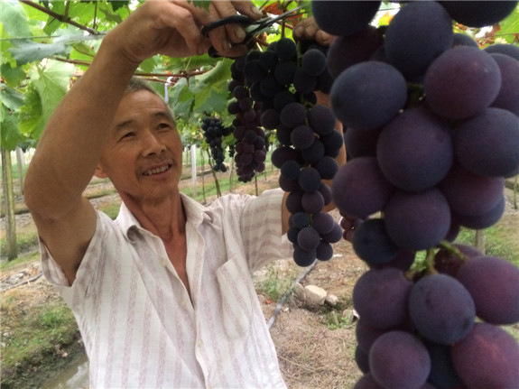 近日,新前街道下曹村葡萄种植大户张正富夫妇俩正忙着在葡萄基地里摘葡萄。今年,他种植的30亩大棚葡萄喜获丰收。张正富告诉记者:“这批葡萄预计平均亩产量可达八百多公斤,多半葡萄已被金华客商和当地超市、商贩预购,经济收入可超四十万元。”