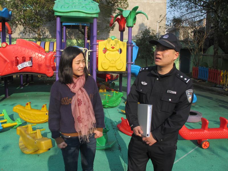 为全力做好校园各项安全防范工作,连日来,院桥派出所组织民警深入辖区中小学校、幼儿园走访检查,了解校园园周边治安、配备保安、监控设施等情况,全力推进平安校园的创建活动。图为2月28日下午,民警在辖区一幼儿园走访检查,了解周边治安情况。