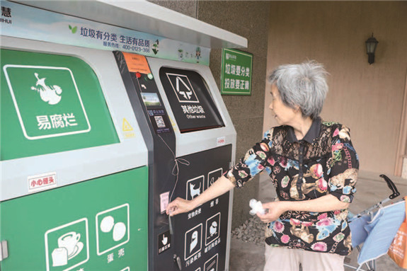 5月13日上午,家住玫瑰湾小区的冀阿婆,带着小孙子提着已分类打包好的垃圾,来到离家不远的智能垃圾投放点。冀阿婆对着这套智能垃圾分类设备刷了下垃圾分类积分卡,黑色垃圾箱的投放口就自动打开了。自从小区正式推行智能垃圾分类举措以来,冀阿婆一家几乎每天都会将生活垃圾分类后再投放。“我家垃圾分类工作一般由我媳妇弄,她还拿积分换回过不少纸巾和洗手液。”冀阿婆笑着说,在家进行垃圾分类也不会花多少时间,既能有积分又能改善环境,他们家挺乐意参与的。